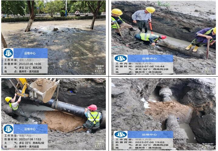7月6日上午10點20分,客服人員接到群眾的熱線電話,告知清河路清河庭院附近路面大量跑水,運維中心搶修人員接到消息迅速前往,十五分鐘到達現(xiàn)場,通過專業(yè)技能和判斷,確定為DN400主管道爆破,測漏人員立即協(xié)助精準定位漏點,盡量減少開挖面,為搶修爭取時間,該管道會直接影響周邊黃龍五隊、清河庭院、東方小區(qū)、楚苑小區(qū)、雙橋家具大市場等小區(qū)和企業(yè)大面積水小或停水。酷暑難耐,為盡快解決群眾用水問題,維修人員在35°高溫下連續(xù)奮戰(zhàn)8小時,于當晚7點30分恢復(fù)正常供水,及時避免了周邊居民下班后正常生活用水的問題。
