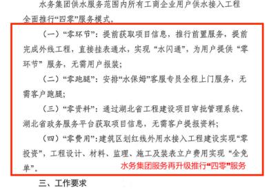 1.“零環(huán)節(jié)”:客戶需要用水時,即時通水; 2.“零跑腿”:安排“客服專員”全程上門服務,無需客戶跑腿; 3.“零資料”:通過湖北省工程建設審批系統(tǒng)、湖北省政務服務平臺獲取項目信息,無需客戶提報資料; 4.“零費用”:針對企業(yè)用戶供水接入項目,工程設計、材料、監(jiān)理、施工全部免費。 |